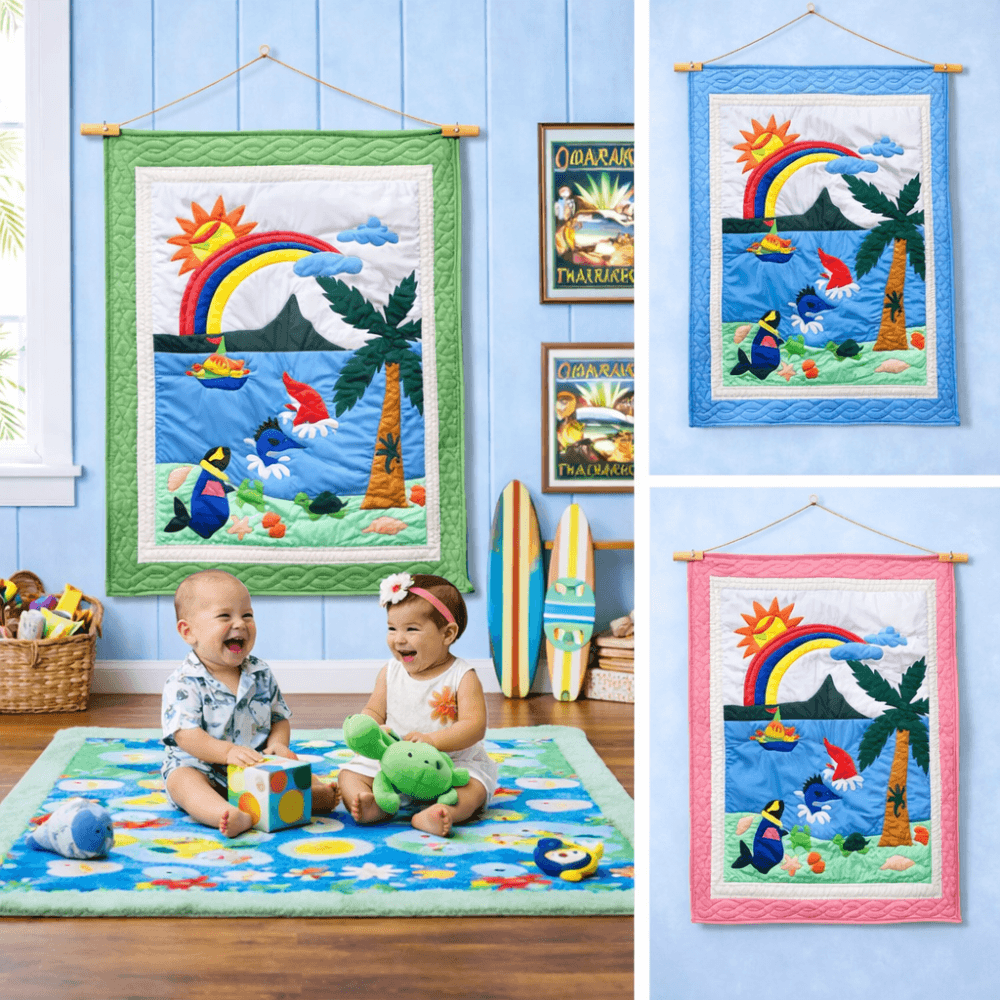 The Cool Sun baby quilt brings a bright and joyful island scene into your child’s space. It features a colorful design with a shining sun, rainbow, ocean waves, and playful sea life. This cheerful combination creates a fun and uplifting atmosphere in any nursery or playroom.