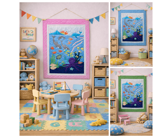 This Octopus Garden baby quilt brings a playful ocean theme into your child’s space. It features a charming underwater scene filled with sea life and a friendly octopus design. The soft colors and detailed artwork create a warm and inviting look for any nursery or playroom.