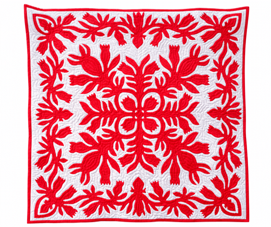 Bring the spirit of aloha into your home with this Hawaiian Quilt Wall Hanging featuring a vibrant Red Lei Design, also known as Rosalinda. This striking 42" x 42" quilt showcases red floral motifs that symbolize love, honor, and celebration.